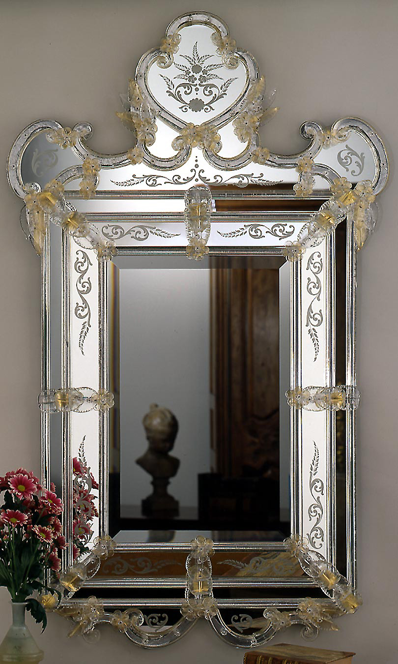 H49 W29 Venetian Mirror with Floral Design & Amber Glass