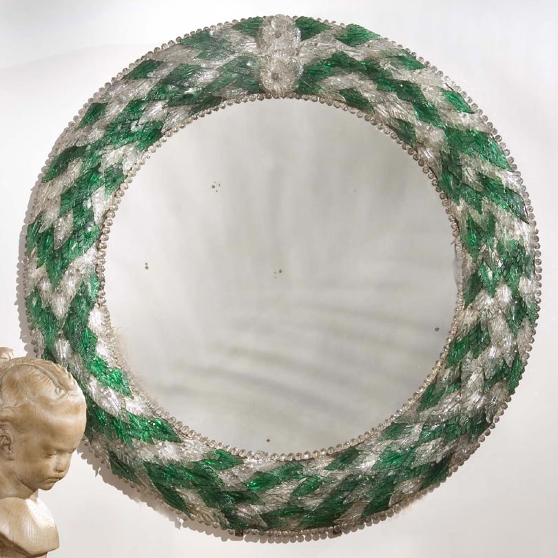 D38 Round Murano Mirror with Antique Green & Crystal Glass Leaves